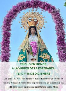 Hermandad de Nuestra Señora de la Esperanza Últimas Noticias Calendario Noticias TRIDUO EN HONOR A NUESTRA SEÑORA DE LA ESPERANZA Leer más Informe tesorerÃa 2024 El dÃa 6 de abril rezaremos el rosario en la...Leer más Rosario 6 abril 2024 El dÃa 6 de abril rezaremos el rosario en la...Leer más Cargar más Calendario de eventos de la Hermandad de Nuestra Señora de la Esperanza